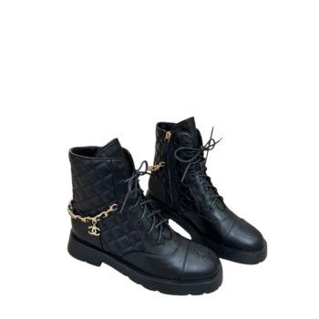 CHANEL QUILTED CHAIN LACE UP COMBAT BOOTS BLACK $375.00Select options