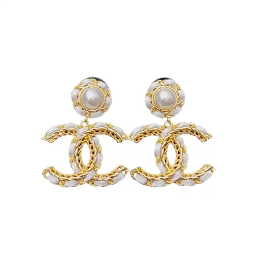 CHANEL WHITE LEATHER AND GOLD METAL EARRINGS
