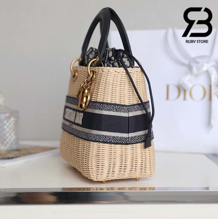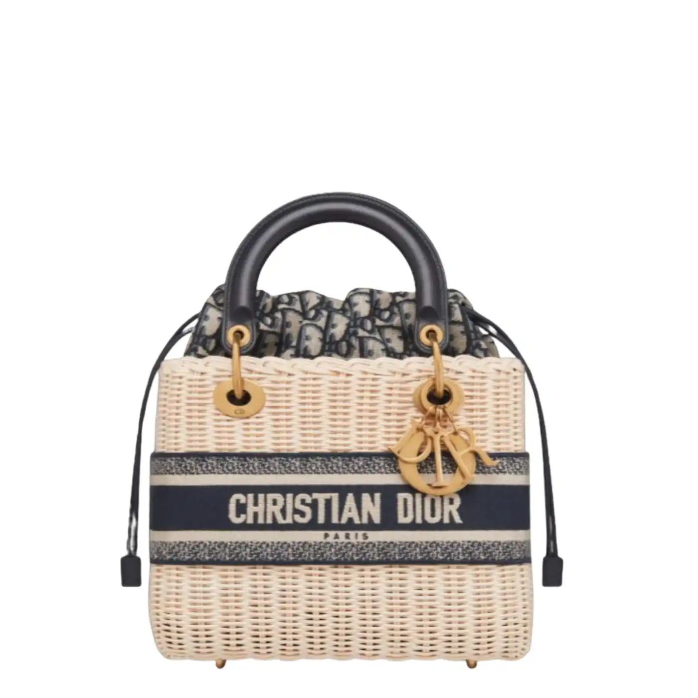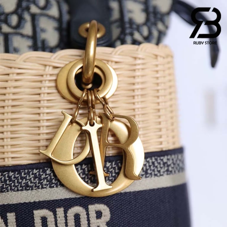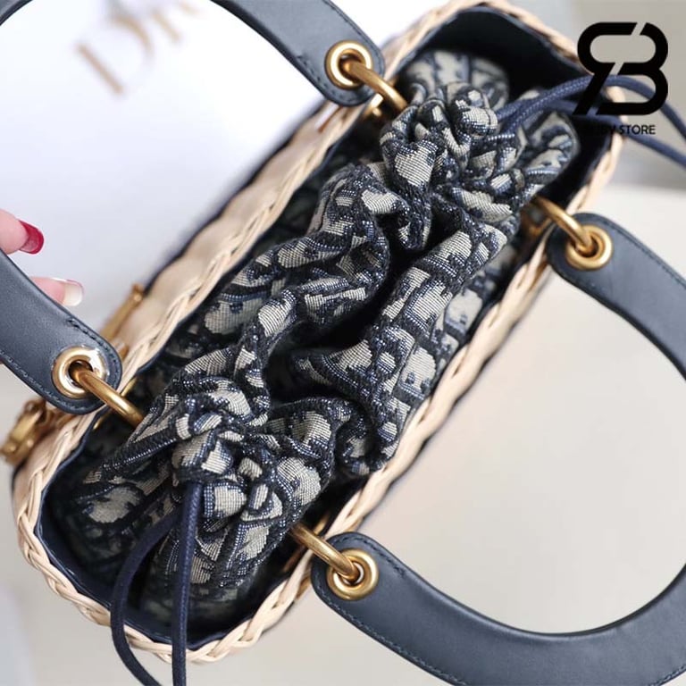 DIOR MEDIUM LADY NATURAL WICKER BLUE CORNFLOWER OBLIQUE JACQUARD