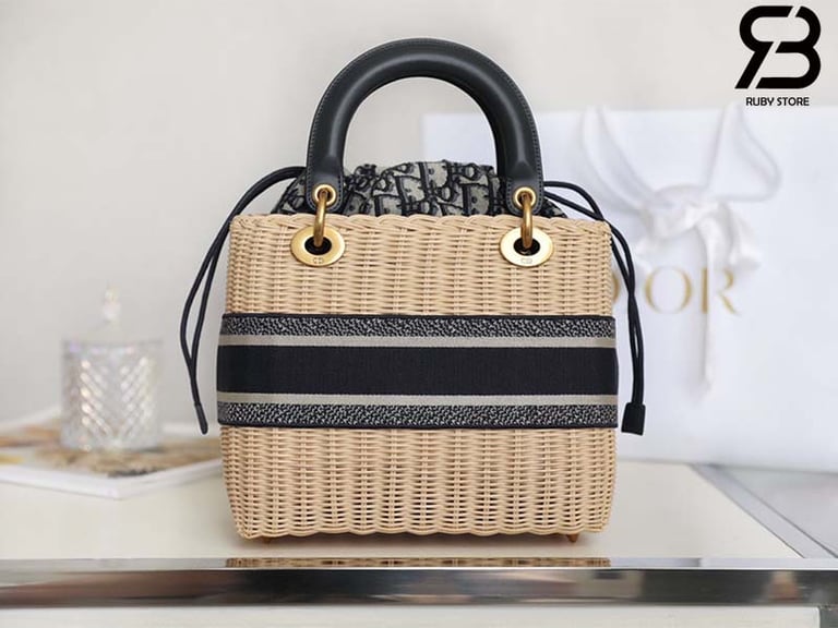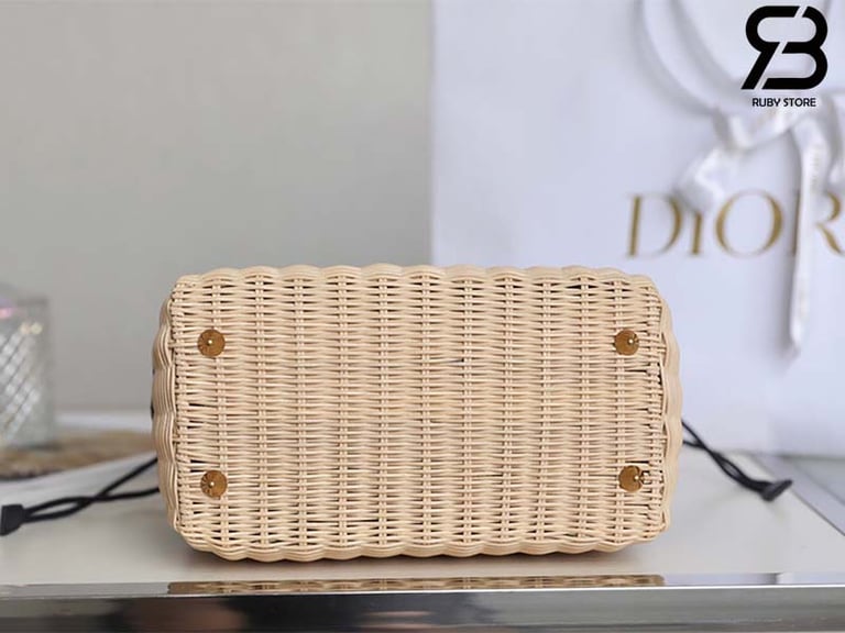 DIOR NATURAL WICKER AND BLUE DIOR OBLIQUE JACQUARD BAG