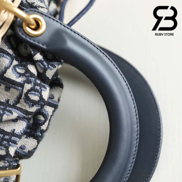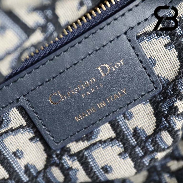 The bag features a blue Dior Oblique jacquard interior pouch with a drawstring as well as a CHRISTIAN DIOR PARIS embroidered band on the front.