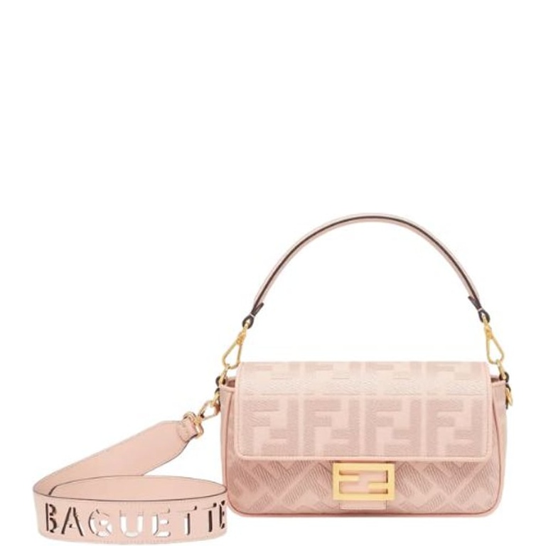- Baguette bag made of pink canvas with an raised FF motif created with tone on tone embroidery, trimmed in matching-colour leather and adorned with an FF clasp.