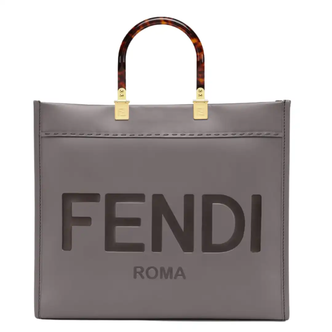 - Medium Sunshine Shopper bag made of grey leather with hot-stamped “FENDI ROMA”and stiff tortoiseshell plexiglass handles.