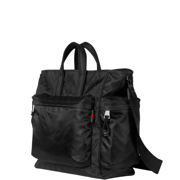 - Part of the Cruise 2025 collection, this men’s tote combines clean, modern lines with a sporty aesthetic. Crafted in black GG-pattern nylon, it features an allover motif complemented by a classic green and red Web stripe.