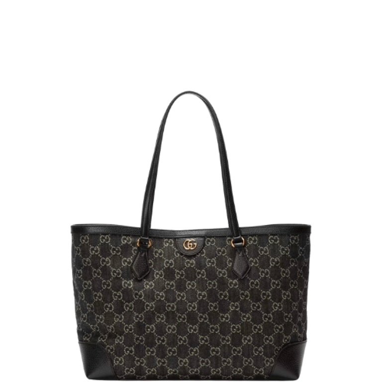 This stylish tote bag comes in cool black and ivory GG denim jacquard. It has shiny gold-toned hardware and a nice leather lining inside. Keep your small items safe in the interior zipper pocket.