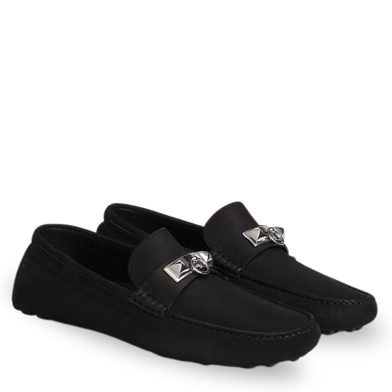 - Driving loafer in tanned nubuck with hand-stitched apron and palladium-plated Collier de Chien hardware.