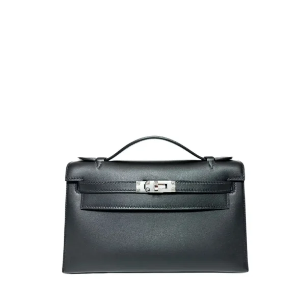 HERMES KELLY POCHETTE BOXCALF SILVER HARDWARE BLACK 23CM
