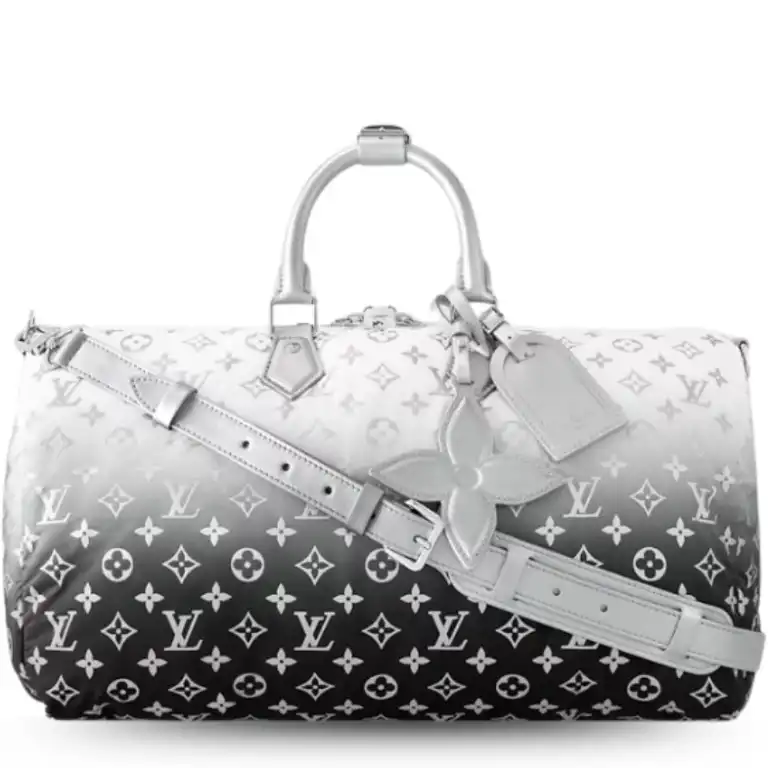 - This Keepall Bandoulière 45 travel bag is made from gradient Monogram Nylon with its wintery feel and is adorned with a white-leather Monogram Flower charm. The recycled nylon is resistant and soft to the touch, making the bag very body friendly. The removable leather strap adjusts for shoulder or cross-body wear.