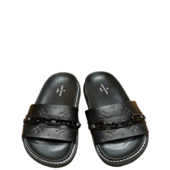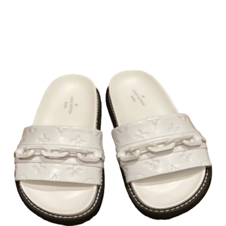 • The strap is embellished with an oversized, color-matched resin chain referencing Louis Vuitton. This easy-to-wear slide has a comfortable anatomic insole and a lightweight micro outsole.