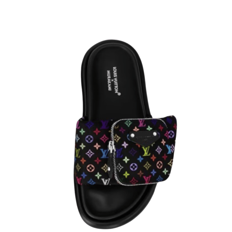 The Pool Pillow flat comfort mule from the cross-category Louis Vuitton x Murakami collection makes a bold contemporary statement thanks to a wide, padded velcro strap embellished with a zipped pouch. The allover Monogram motif is vibrantly uplifted in cheerful tones inspired by Japanese artist Takashi Murakami’s signature multicolored aesthetic, while an anatomic footbed and lightweight treaded outsole offer casual comfort.
