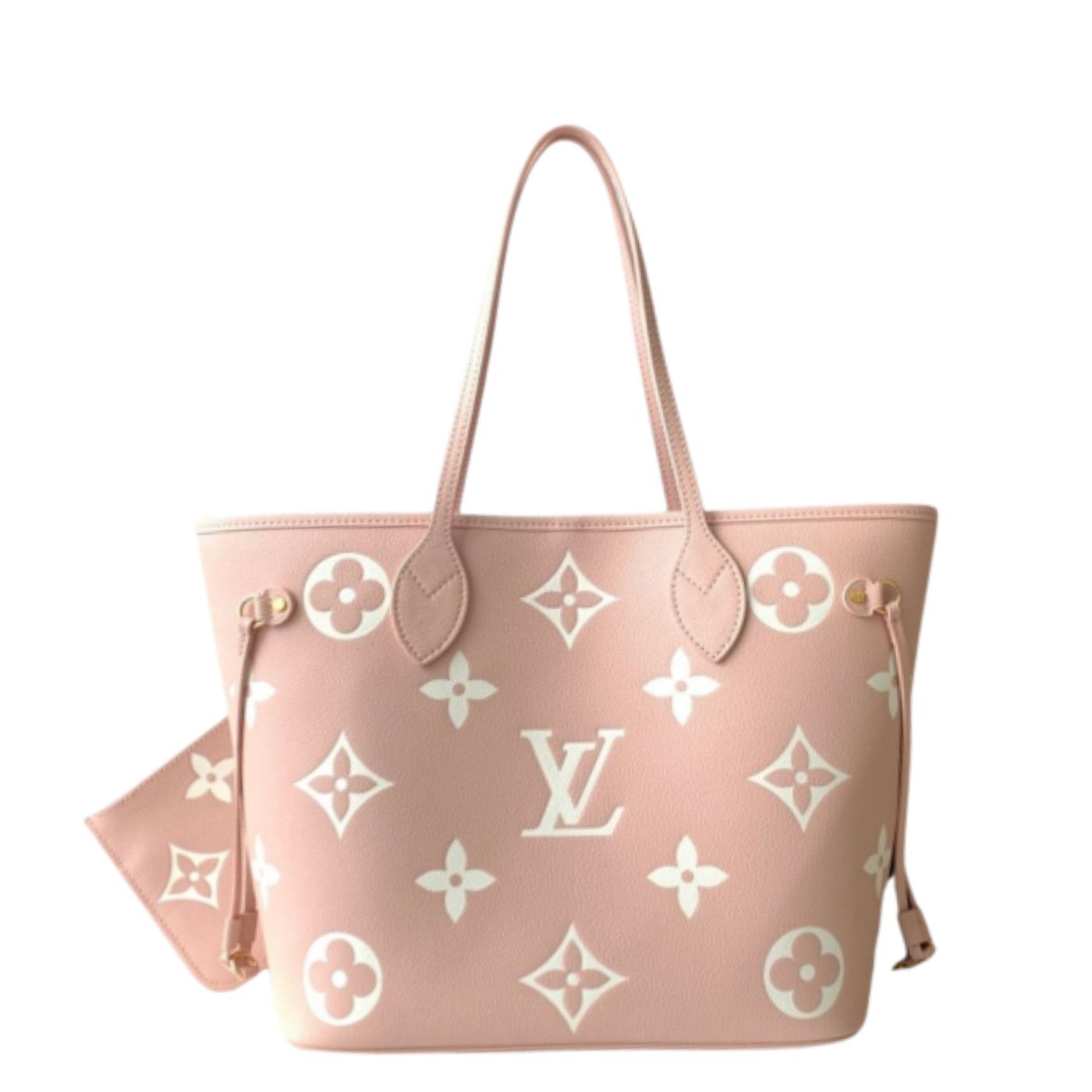 The Neverfull MM tote is crafted from embossed Monogram Empreinte leather, featuring cream-colored Monogram Blossoms and LV motifs set against a soft pink background. Designed for versatility, the side laces can be tightened for a sleek silhouette or loosened for a more relaxed look with easy access to the interior.