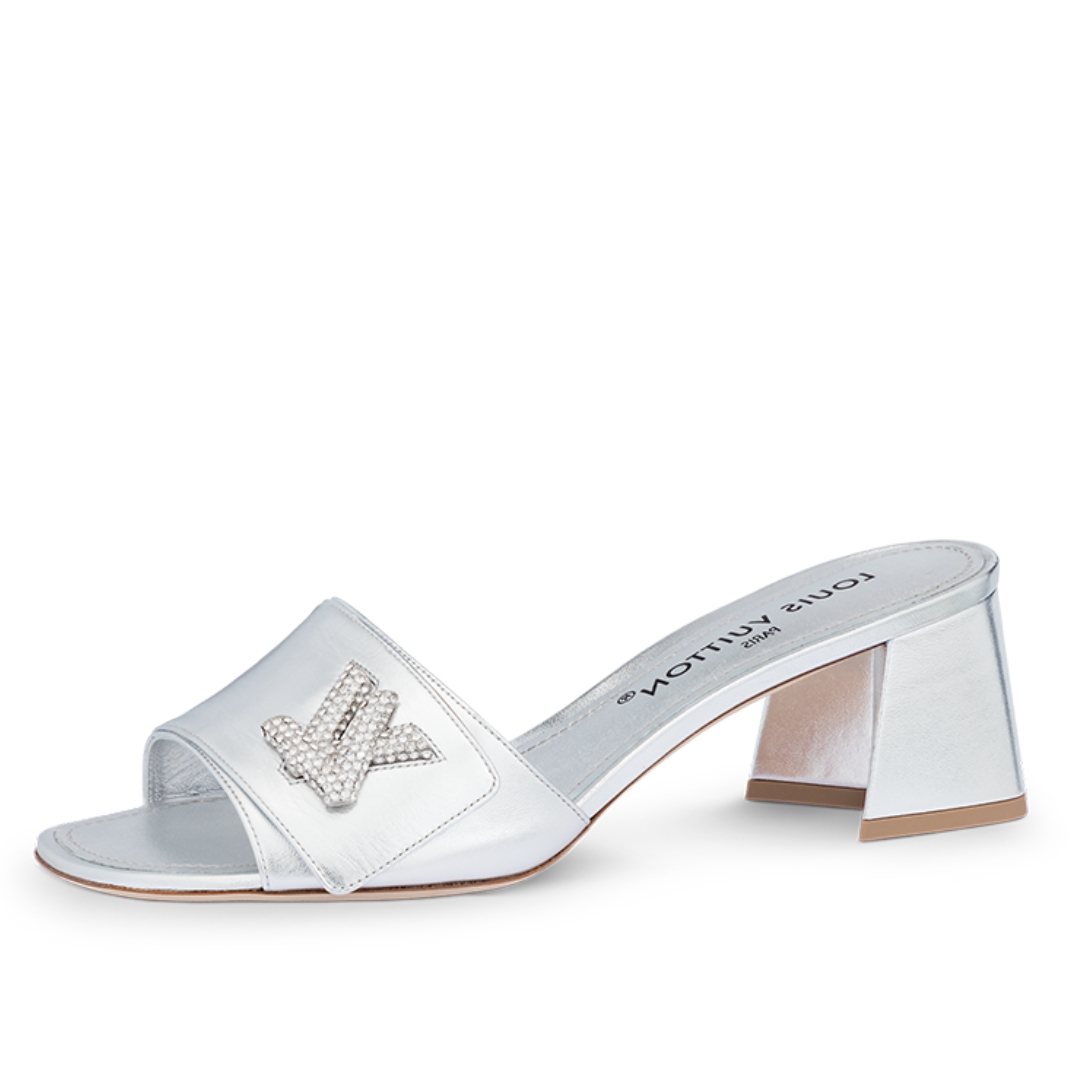 • Metallic brings added glamour to the Shake mule, a modern style notable for its high block heel with a graphic V shape. The wide front strap is embellished with a jewel-like LV accessory, entirely covered in crystals, which references the iconic Twist handbag. An oversized Louis Vuitton signature is printed on the insole.