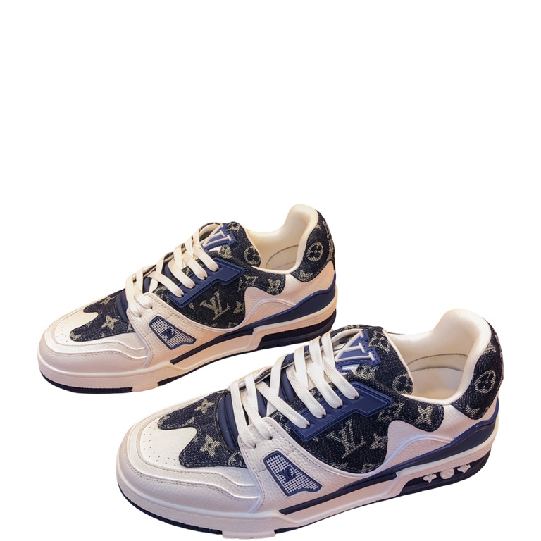 Designed by Louis Vuitton Artistic Director Virgil Abloh, the iconic LV Trainer sneaker is revisited this season in Monogram denim. The contrasting colors and materials highlight the elaborate construction of this model, which was inspired by vintage basketball sneakers. A single pair takes seven hours to stitch