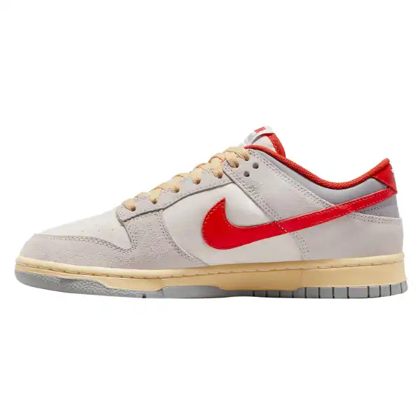 - Said to be the latest addition to Nike’s “Athletic Department/Company” collection, this Dunk Low opts for a vintage motif while being constructed out of a White canvas base, Grey suede overlays and Red leather Swooshes and heels.